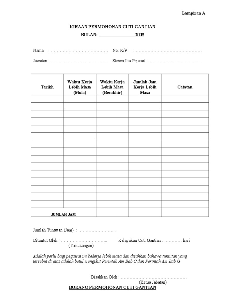 Contoh Borang Tuntutan Kerja Lebih Masa Kerajaan Rm Jumlah Jam Hari Kerja Biasa Hari Rehat Biasa Hari Kelepasan Am Kerja Siang 1 125 Kerja Malam 1 25 Kerja Siang 1 25
